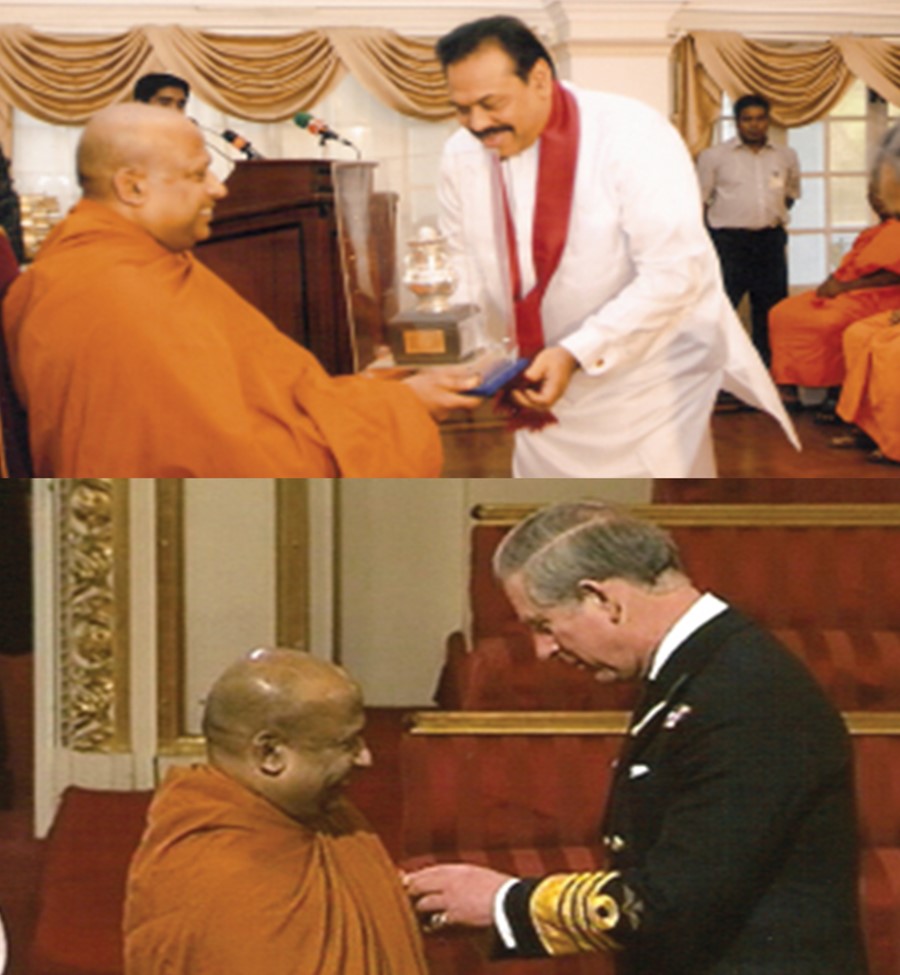 The Birmingham Buddhist Maha Vihara was established in 1992 by Ven. Dr. Witharandeniye Kassapa (O.B.E.) the present chief incumbent of the Maha Vihara. He is also the President of the Midlands International Buddhist Association in the U.K. and the International Buddhist Relief Organisation (I.B.R.O.), which is affiliated to the United Nations. The images show the Prince of Wales awarding the O.B.E. to Ven.Dr. Witharandeniye Kassapa and recieving an ward by his excellency Mahinda Rajapaksa ,the President of Sri Lanka.