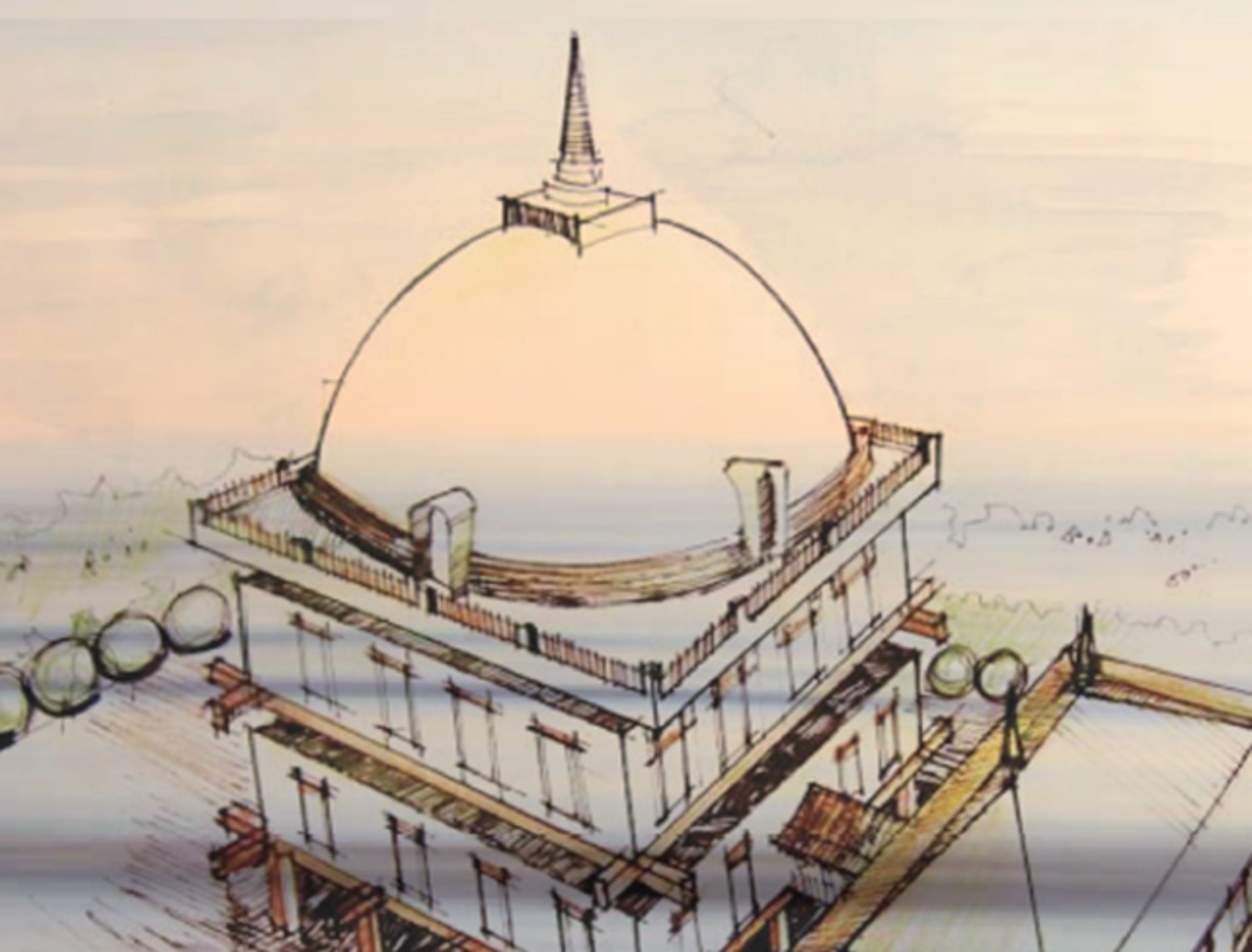 The ‘stupa’ is clearly the most prominent element of the scheme and symbolises the teachings of the Buddha. The shape of the ‘stupa’ has been interpreted in different countries in a number of ways. In Sri Lanka the dome is constructed out of half a sphere with a number of cuboid forms above this which is capped by a conical spire. This form symbolises the path to attaining Nirvana or Enlightenment.